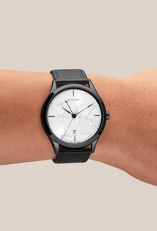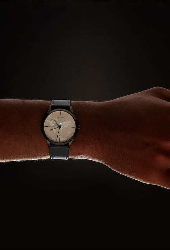 Swiss Made. Minimalist sunray world map dial with scattered superluminova points representing cities around the globe that illuminate by night. Slim and elegant black hour, minute & second hands. Independent 24 hour GMT hand with red tip. Round 40mm black stainless steel watch case. Anti-reflective sapphire crystal glass. Push down crown - inspired by the waves of the sea. Date window at 6 o’clock